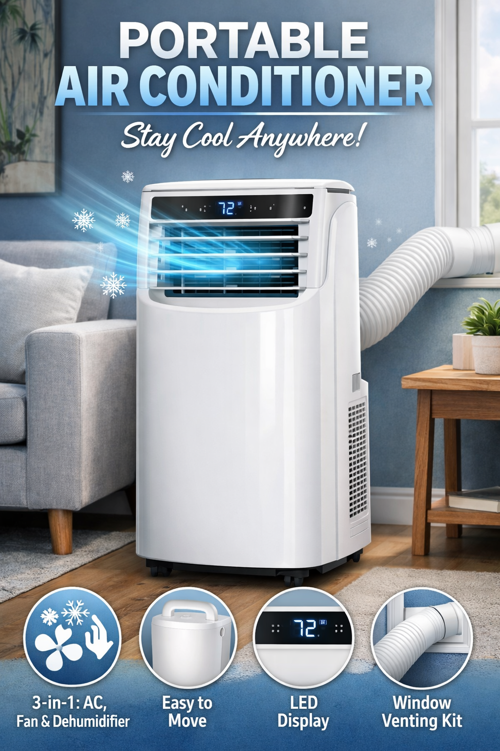 A portable air conditioner is a compact cooling device that you can move from one room to another. Unlike split or window ACs, it does not need permanent installation. You plug it in, place the exhaust pipe near a window, and enjoy cool air.