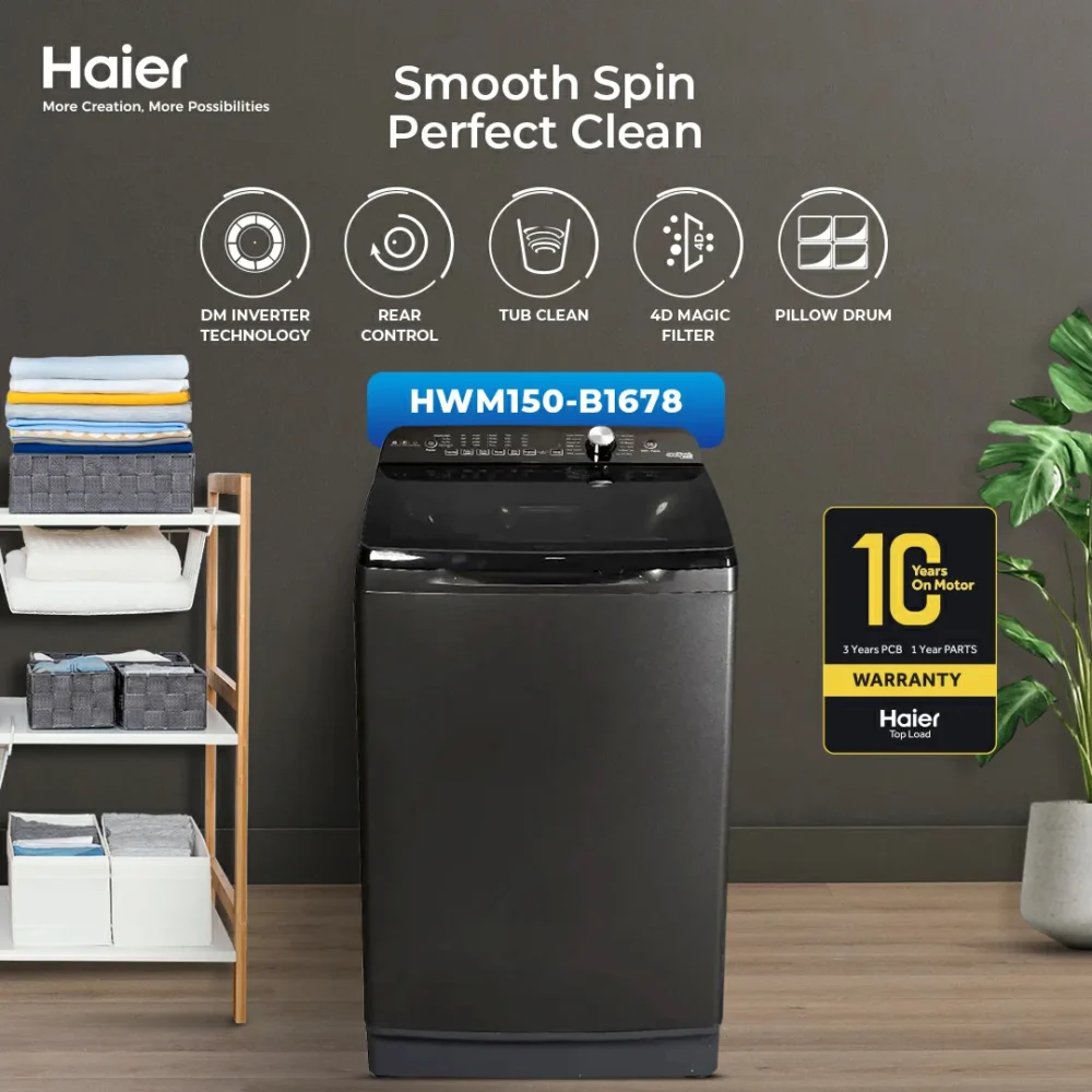 The Haier Washing Machine HWM-150-B1678 is a premium top-load washer designed for heavy laundry loads. With its 15 kg capacity, fully automatic operation, and multiple wash programs, it ensures deep cleaning and fabric care with every cycle. Its energy-efficient motor, rust-proof body, and high-speed spin make it a durable and cost-effective choice for modern households.
