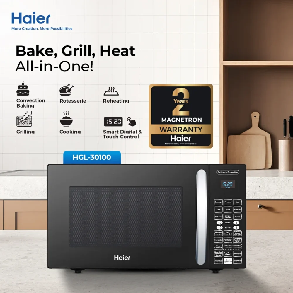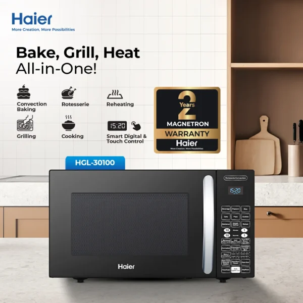 The Microwave Oven HMW-30100 is a versatile and high-performance appliance designed for modern kitchens. With its 30-liter capacity, it is suitable for medium to large families who enjoy grilling, baking, roasting, or reheating meals efficiently.