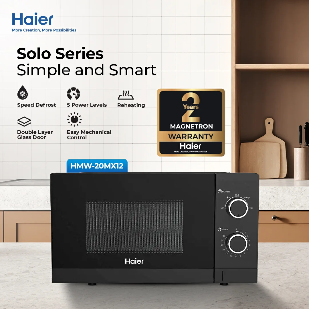 The Microwave Oven HMW-20MX12 is a reliable, compact, and efficient appliance ideal for small households, students, and office kitchens. With a 20-liter capacity, it fits neatly on any countertop while delivering consistent cooking performance.