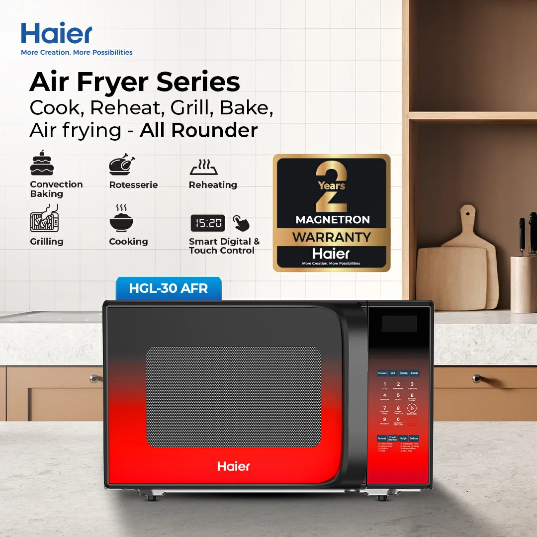 The Microwave Oven HMW-30AFR is a modern and versatile kitchen essential designed for effortless cooking and healthy living. With its 30-liter capacity and Air Fry technology, it allows you to cook crispy, delicious meals with little to no oil — perfect for health-conscious users.