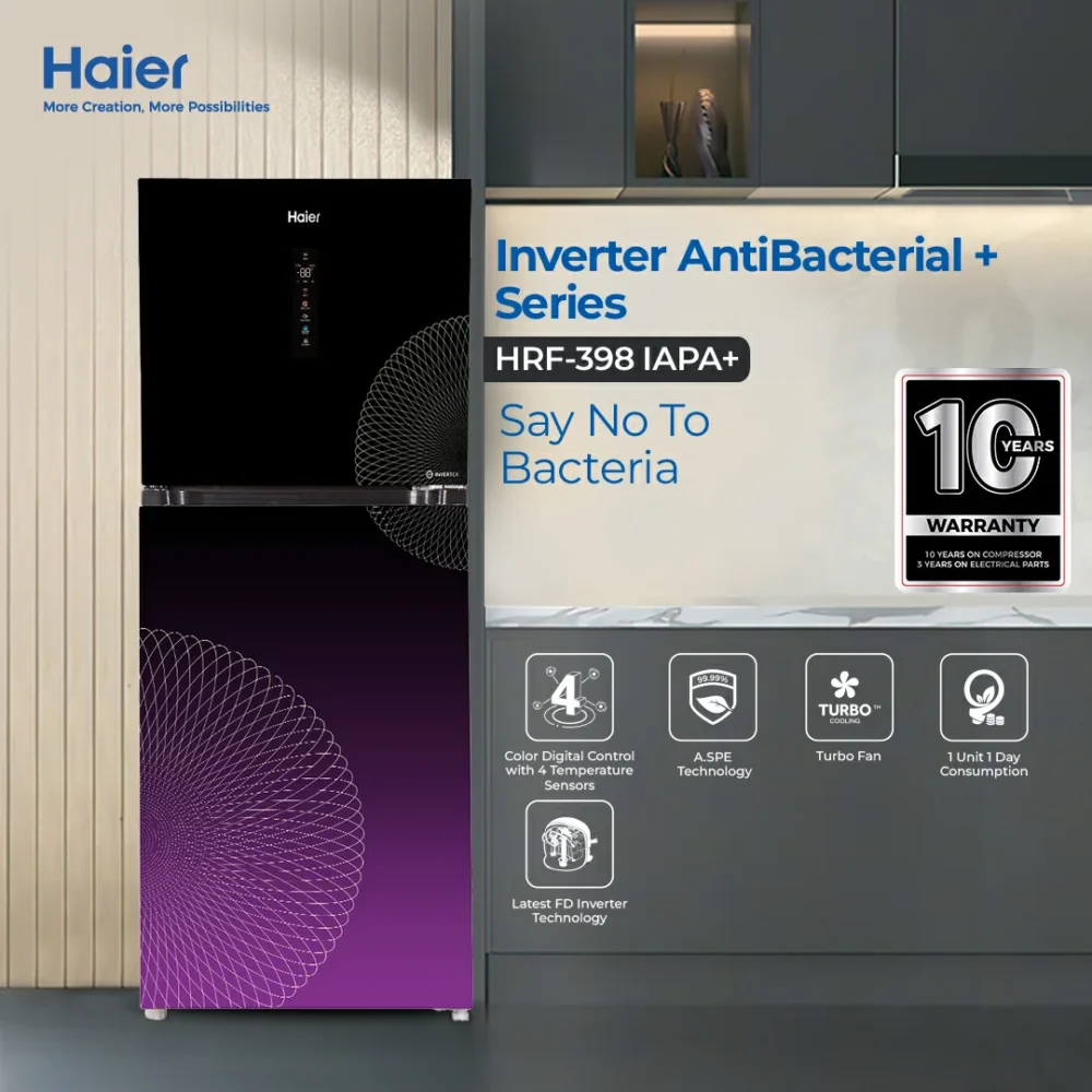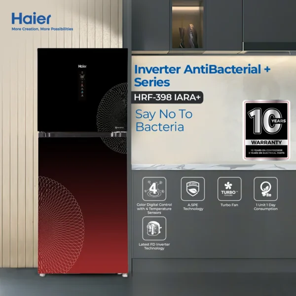 With spacious compartments, durable tempered glass shelves, and a 3-year compressor warranty, the HRF-398IAPA offers a reliable and luxurious cooling experience for every home.