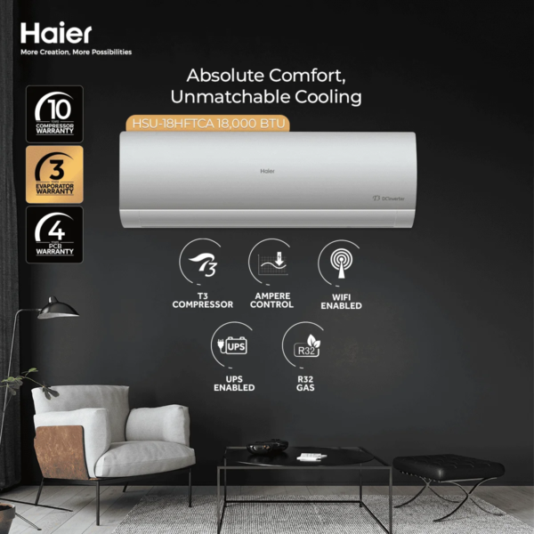 The Haier HSU-18HFTCA is a next-generation DC Inverter Split Air Conditioner featuring Haier’s advanced Triple Inverter Plus technology for faster cooling, lower noise, and up to 66% energy savings. With built-in Wi-Fi and smart control, you can operate your AC anytime, anywhere using your smartphone. Perfect for modern homes demanding performance and convenience.