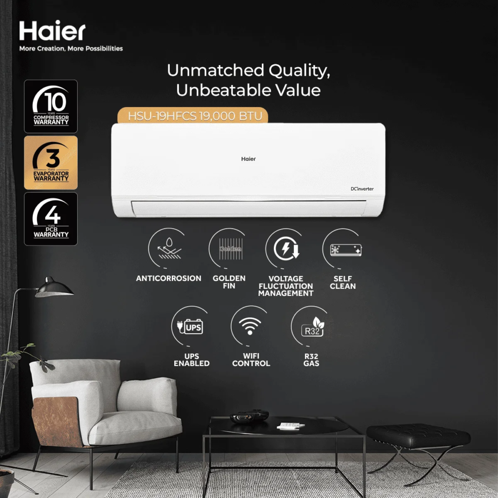The Haier HSU-19HFCS is a premium DC Inverter Split Air Conditioner that combines performance, style, and efficiency. Designed for medium to large rooms, it ensures quick cooling, low noise operation, and reduced electricity consumption. The durable build and self-clean technology keep your air fresh and healthy every day.